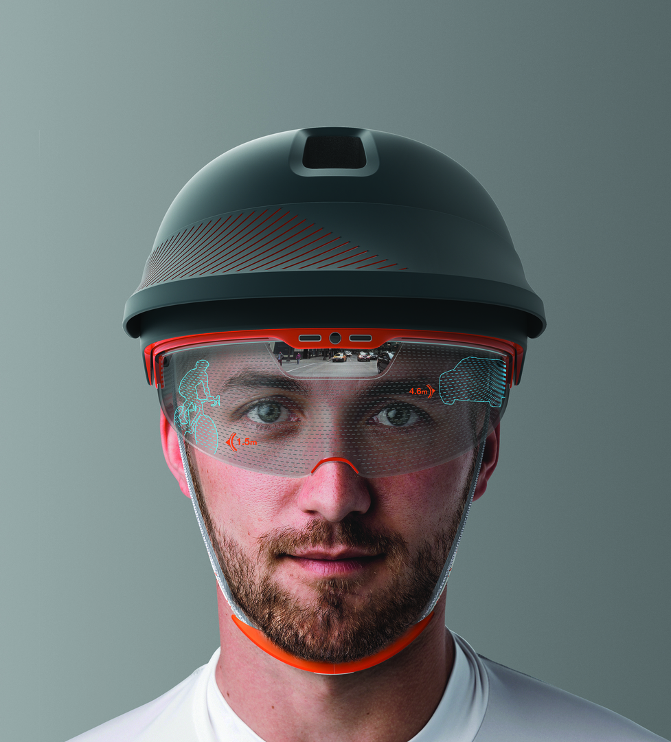 Cycling as a sport, fitness activity and general mode of transport is constantly increasing in popularity with more people taking to the roads every year. Roads are becoming more congested especially in urban environments and this can make cycling a more difficult task. The ability to analyse and react to a situation relies on a cyclist being fully aware of his or her surroundings. Optic gives cyclist the peace of mind to make the right decisions on the road, with total awareness and a full understanding of personal progression. This device provides cyclists with the visual information to make safer decisions and avoid potentially dangerous road situations by integrating front and rear cameras with 360-degree proximity and collision detection. The act of wearing an obvious camera when cycling was the key driver for the aesthetic of the camera feature on the rear of the helmet. Highlighting the raised lens detail and the proximity sensor ensures that any approaching drivers know their actions are being recorded. The visor doubles as a heads-up display where Optic live-streams the rear camera and highlights potential risks. This allows the user to focus on the road ahead with full awareness of their surroundings. Cyclists are able to customise the heads-up display to monitor the information they need for their specific journey. The display options include: a live stream of the rear camera, a proximity dot-matrix or gauge to show the distance of approaching hazards, augmented reality route navigation and journey statistic interfaces. The design language aims to differentiate Optic from the streamlined, aggressive aesthetic of conventional helmets. It integrates a retractable visor, which once opened, creates visual alignment with the cap and other details on the helmet to visually reinforce the functional aspects of the design. Optic is the visionary approach to safe cycling.