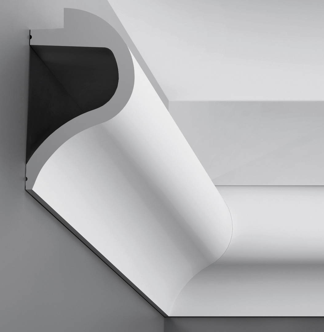 The Wave, a profile for indirect lighting, blends in harmoniously with any architecture thanks to its organic shape with round curves. When painted, the cornice might even look as if it were an integrated part of the wall. Apart from this effect, it also makes rooms appear more spacious. This cornice for indirect LED lighting is regularly used to direct light upwards but can also be used in other ways to create discrete and playful effects for every type of room.