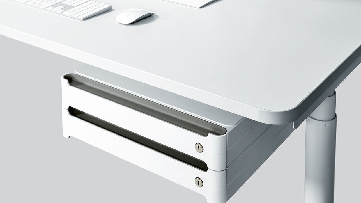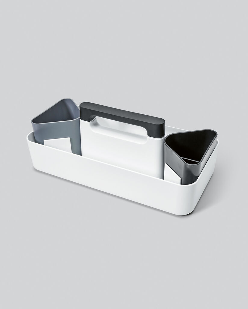 OrgaMove is a practical materials box, with which personal work utensils can be transported and stored away comfortably. Dividers help securing the items inside, from tablets to coffee mugs. With its soft grip handle, the box made from recyclable plastic is convenient to carry. Its subtle design harmonises with any office furniture, and with multiple colours available for the pencil holder it can be individualised to match the surroundings.