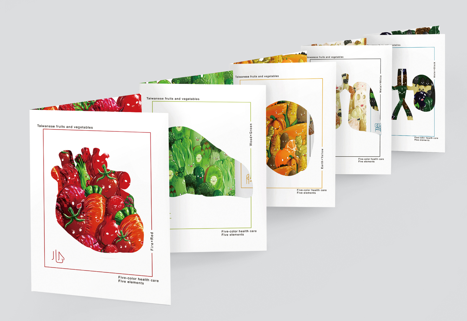 This guide to a healthy diet with Taiwanese fruits and vegetables is based on the traditional Chinese concept of the Five Elements. Posters and brochures present the organs associated with the five basic elements: heart, liver, spleen, lungs and kidneys. Since each motif is provided with a special colour, viewers can immediately recognise which food is beneficial for a particular body function. By showing the organs as miniature worlds with helpful nutrient spirits inside, the design of the illustrations appeals to the audience to take a closer look at the pictures.