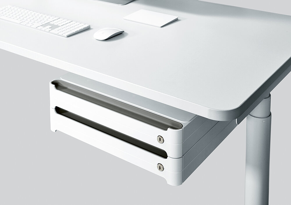 OrgaWork is a subtle and elegant drawer to be mounted under desktops or reception counters in order to keep work utensils and personal items safe and within reach. The lockable two-component drawer with integrated non-slip and noise-reducing bottom was made from recyclable plastic. Full extension guides make the usable space accessible in full. These guides are covered by ledges and equipped with a damping feature and a soft closing system for comfortable use.