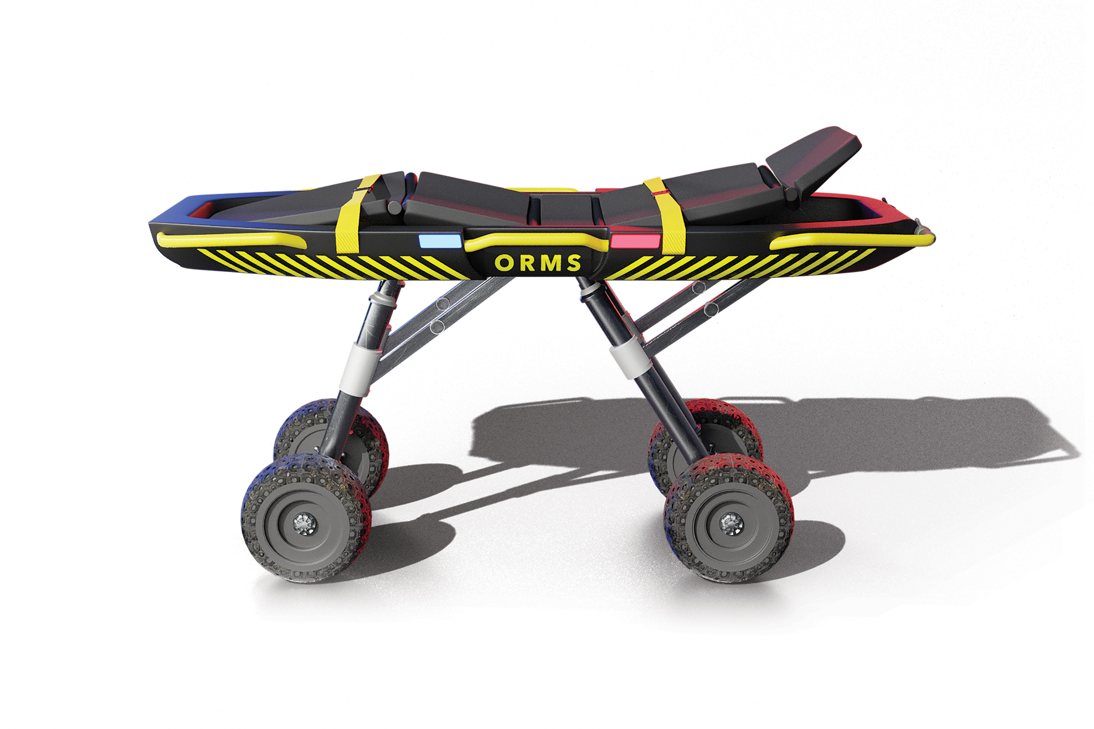 ORMS keeps patients horizontal with an auto-levelling surface, even on rough terrain. It is semi-autonomous, orienting itself when pulled, and can be manually controlled with thumb-operated throttle levers. Powered by electric servo motors, it has a 7.5 km range and recharges in 45 minutes. Fitting in ambulances ensures accessibility and independent limb movement, fulfilling a crucial role in outdoor rescues.