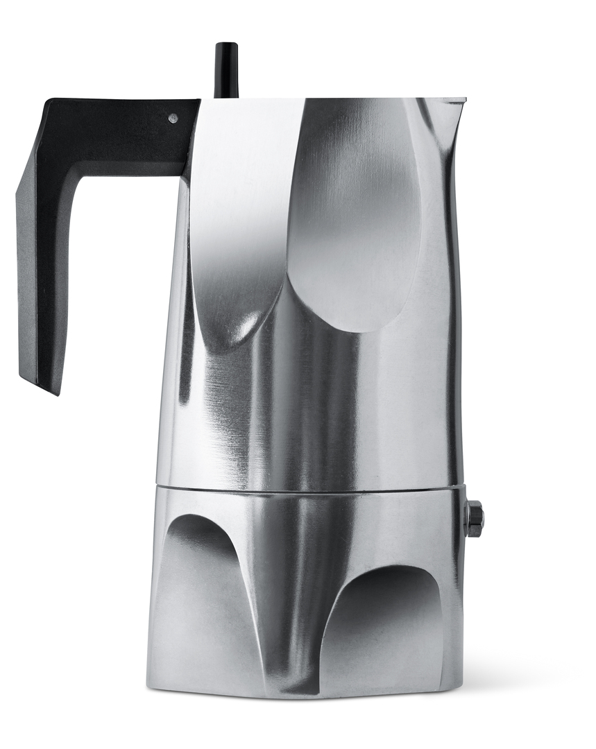 The design concept of Ossidiana follows the objective of combining sculptural aesthetics with the functionality of an espresso coffee maker. The asymmetric contours look as if carved while individually accentuated surfaces quote the appearance of a sculptured stone. Nevertheless, Ossidiana conveys the emotional familiarity of an everyday object. The handle made of thermoplastic resin rests ergonomically well in the hand, providing a secure grip when handling the pot.