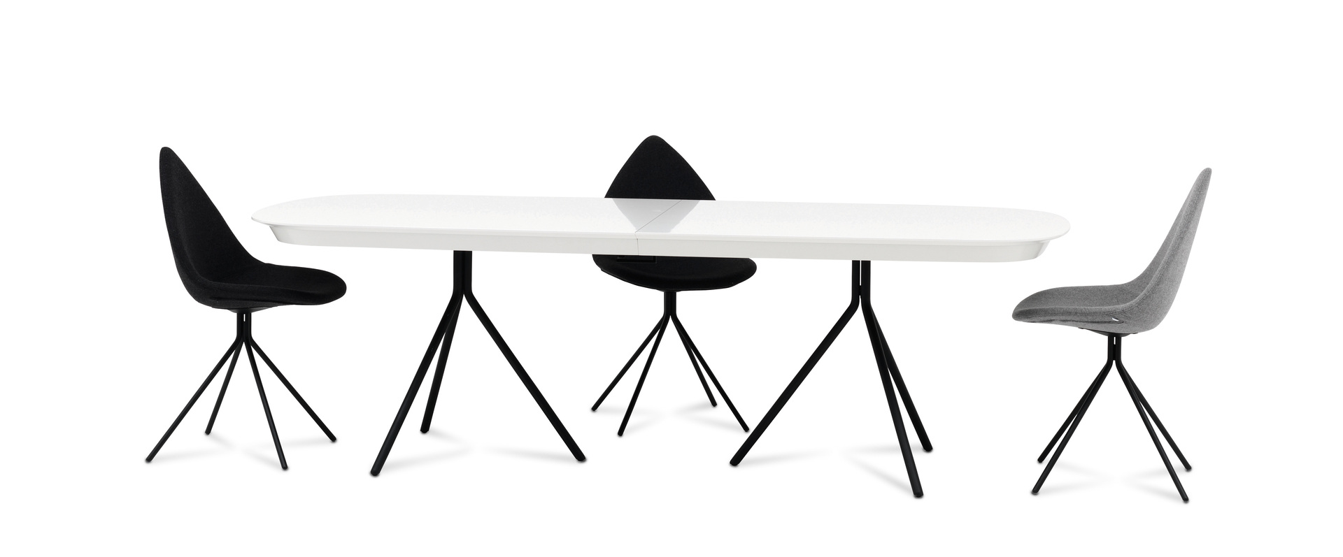 The Ottawa collection is a complete dining room set consisting of a table, chairs and sideboard whose colours and materials can all be customised. The leaf shape of the comfortable dining chairs was inspired by nature. The extendable dining table is functional with a soft, sensual appearance while the sideboard is eye-catching due to the colourful, interchangeable inserts on the sides and behind the handles on the front.