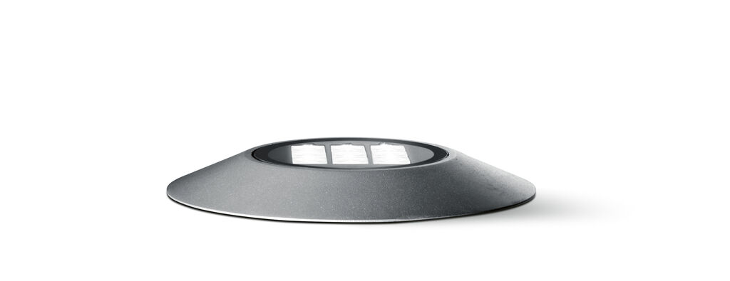 Over-all is a ground spot and its flat polypropylene base plate is directly attached to the surface without an in-ground fixture. With a focus on well-balanced proportions, the design of the luminaire has been reduced to the essentials. Its remarkably flat housing is fixed without visible screws. The spot is suitable for a variety of applications and can be used to illuminate trees and shrubbery just as effectively as the facades of buildings.