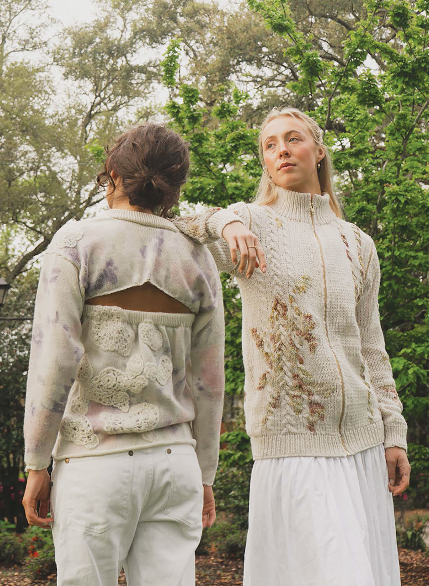 Overgrowth urges its wearer to consider how their love of nature might align with their actions. Part of a collection of textile swatches designed to anticipate natural wear and tear, it uses the amorphous quality of bundle dye and embroidery techniques to reinforce and hiding stains. Thoughtful touches, such as removable sleeves and a hidden message, further invite continuous discovery.