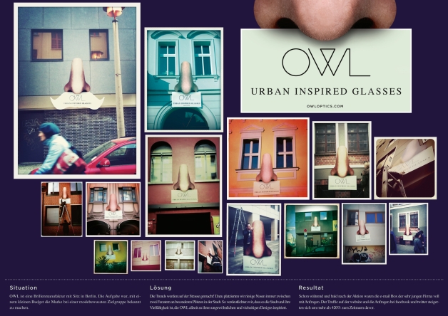 OWL is a manufacturer of glasses based in Berlin. The challenge of this advertising campaign was to raise the awareness of the brand among a fashion-oriented target group using only a small budget. The design concept follows the idea that trends are made on the streets: in particular places around the city huge noses and the logo were placed between two windows, creating urban faces. This communicates that the city and its diversity inspires the manufacturer to its unusual designs.