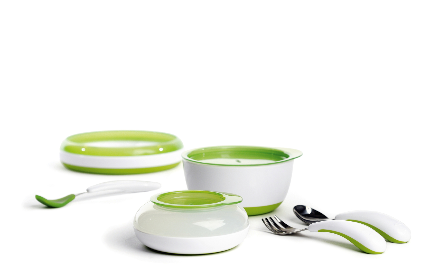 The OXO Tot Feeding Line was developed with the aim to minimize the frustration of a child when it tries to eat on its own for the first time. The cheerful colours appeal to emotions and stress the ergonomically designed product features: thus, the high, concave rim keeps the food on the plate. The tableware adapts to changing needs: when the child grows up and gains more confidence, it is very simple to remove the light green rim. The floor-centred proper weight of the vessels offers enough stability and together with the non-slip bottom, it guarantees that the tableware stays on the table. The generously shaped cutlery handles have a soft, non-slip surface and are therefore easy to hold. Robust fork arms, made of stainless steel, seize the food effectively and safely, while it can easily be scooped by means of the deep spoon. The flat areas on top of the handle are supposed to prevent the fork and spoon from slipping off.