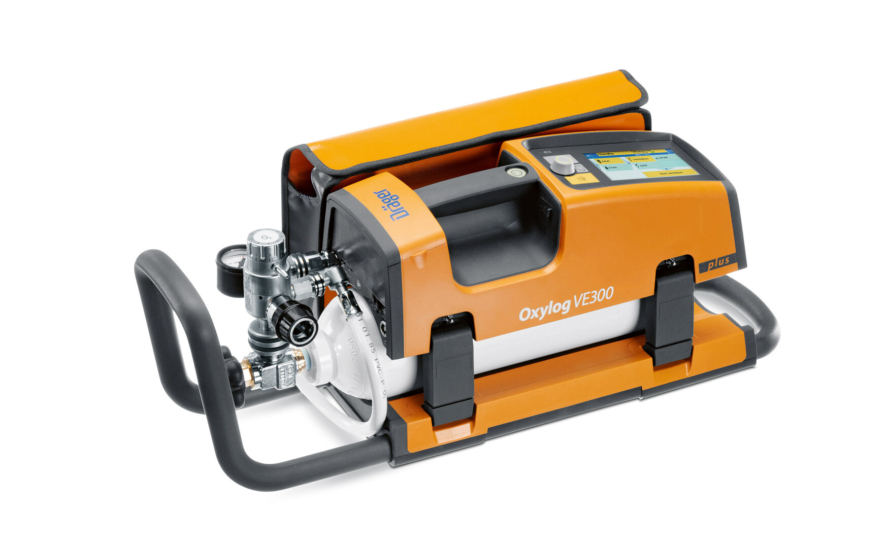 The emergency ventilator Oxylog VE300 features a built-in oxygen cylinder. Its compact design with a weight of only 3.6 kg makes it easy to handle and transport during rescue missions. Thanks to its ideal centre of gravity, the device can be carried conveniently by the handle or using the shoulder strap. The position of the user interface with integrated touchscreen is adaptable to each situation and also offers a clear view of the display when used outside.