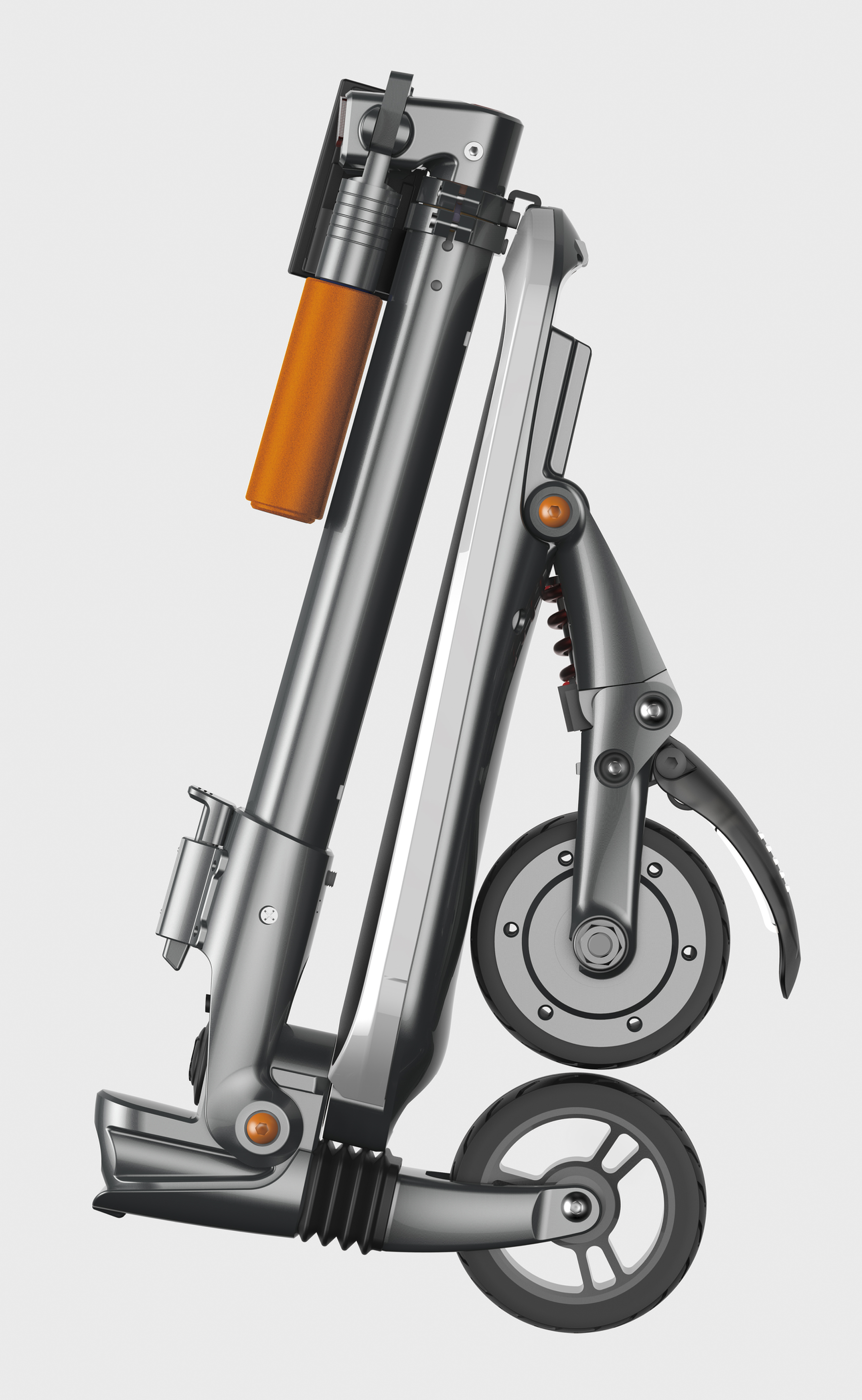The P-SCOOTER (Pack Scooter) is an electric scooter with a very good machine-to-man ratio that makes it perfect as a mode of transportation in a busy city. It is designed to be compact when not in use so that it can fit completely in a backpack. Although public transport networks are more advanced today than ever, public transport is not always the fastest or most direct means to get around, sometimes requiring one to walk for a distance between home and station, or station and destination. With the P-SCOOTER, this inconvenience is eliminated, and the user can reduce the amount of time needed to travel to and from the bus or subway station. To make it even more convenient, the scooter is compact, lightweight and easily folded to fit in a backpack. This lets the user be hands-free and facilitates navigation through crowded streets, stations and spaces. P-SCOOTER is also designed with complete consideration to the user’s riding experience. By increasing the spring’s resistance, it ensures a comfortable ride even when the road is not smooth.