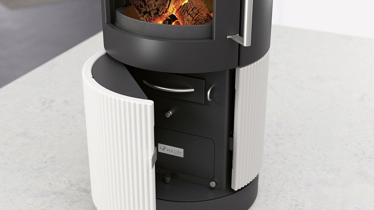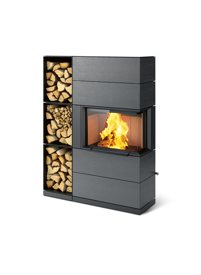 The imposing Padua 160 wood-burning stove offers plenty of room for dancing flames. Its sophisticated design concept includes a sliding door that conveniently and easily opens upwards. The shelf system not only provides plenty of space to store wood, but can also be used for lateral connection to the chimney flue. The wood-burning stove is equipped with handcrafted ceramics in elegant textures. Selected colours enhance the exclusive appearance of the stove. It comes in two heights and, on request, can be equipped with a heat-retaining block.