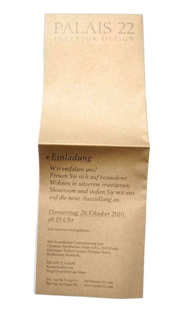 The design of this aesthetically appealing invitation is based on the motif of the silk wallpaper in the new interior design showroom in Frankfurt/Main. The extension of the showroom is reflected in the design of the invitation card for the reopening. “Unfolding” is the theme for the invitation: it is sent as a postcard, but when opened it unfolds into a large-scale DIN A2 format. The peacock as the main motif of the design also illustrates the principle of unfolding.