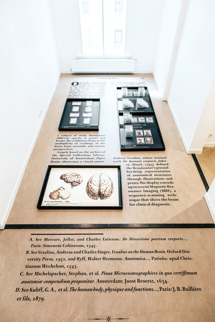 The interactive exhibition “Paper Brains” is a gaze into different reproductions and artistic interpretations of selected skulls and brains re-presentations. Largely based on the archive of the Special Collections Library, University of Amsterdam, the show approaches the question of how the human brain has been represented in books as a subject of study throughout different historical epochs. The exhibition layout follows the idea of presenting a book page in the floor of the gallery space, where its “images” are the displays to be interacted with, and text footnotes are literally “notes” brought to the “foot” of the public that steps into the show.
