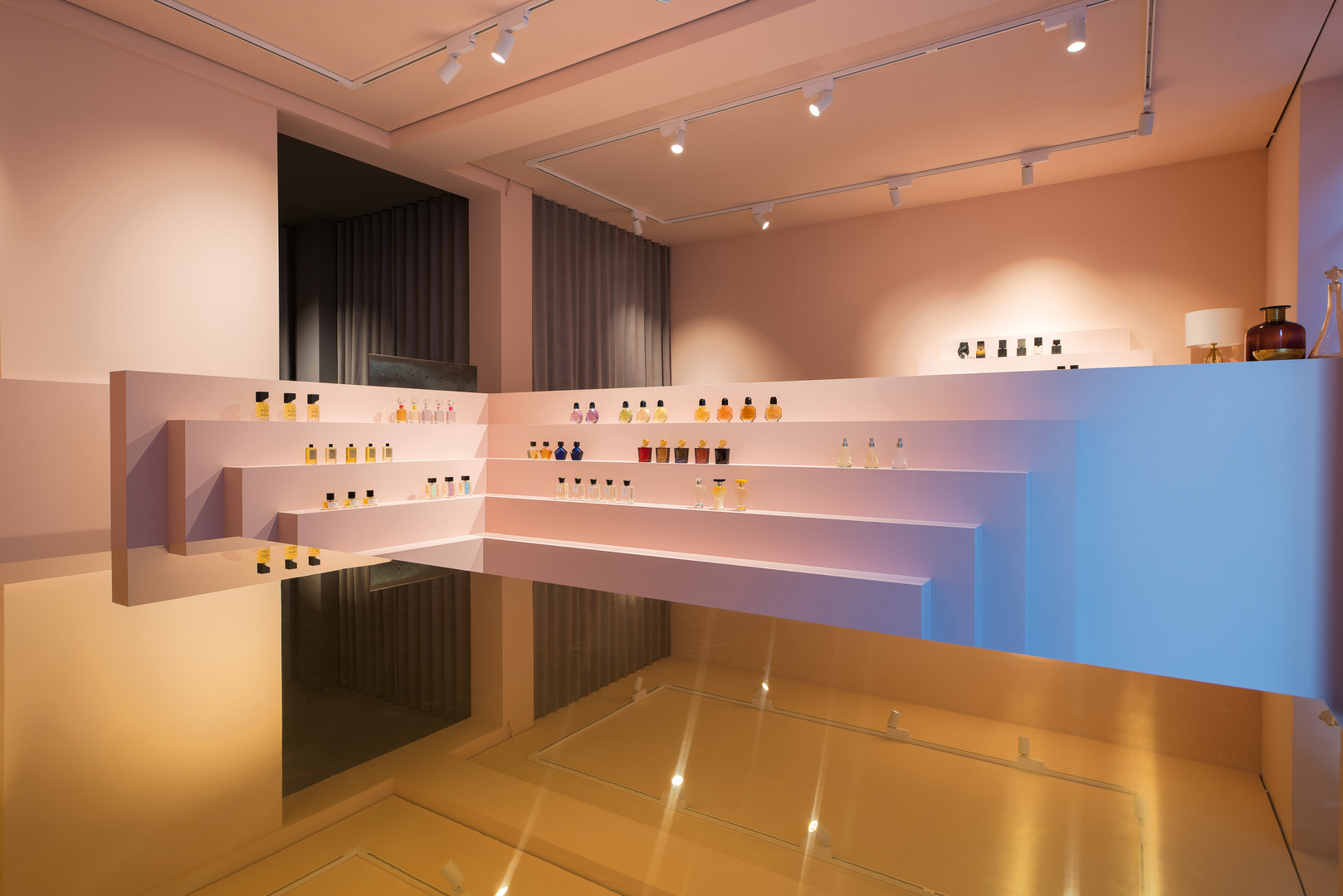 The shop Parfums uniques in Munich, Germany, is dedicated exclusively to niche perfumes. The interior design “tells” or reflects the story behind the carefully curated selection. The three different zones of the store are equally inspired by the motif of a stage and by the three classic phases of the scent process. A massive brass counter in the foreground conveys the presence and value of the “heart note”. The middle ground is formed as a “theatre” with furniture to present the selected bottles like exclusive works of art. And the “top note” is represented by the space that opens upward through the lighting.