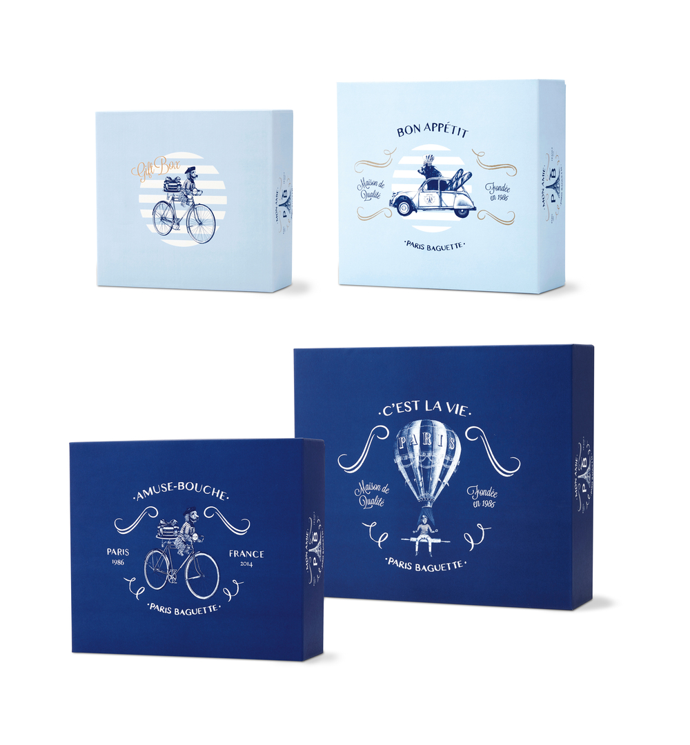 In order to differentiate the gift packages of Paris Baguette from competing products, a series of illustrations of various characters was selected to represent the brand image. The design of each package makes a witty, charming and luxurious impression and features the image of a traditional bakery. Examples of the fun illustrations include a French poodle riding a bicycle with a cake, a patissier bear driving a Citroën car and a Parisian boy in a hot-air balloon. With this imagery and the brandappropriate colour scheme, the packaging aims to appeal to consumers with its warm and friendly design.