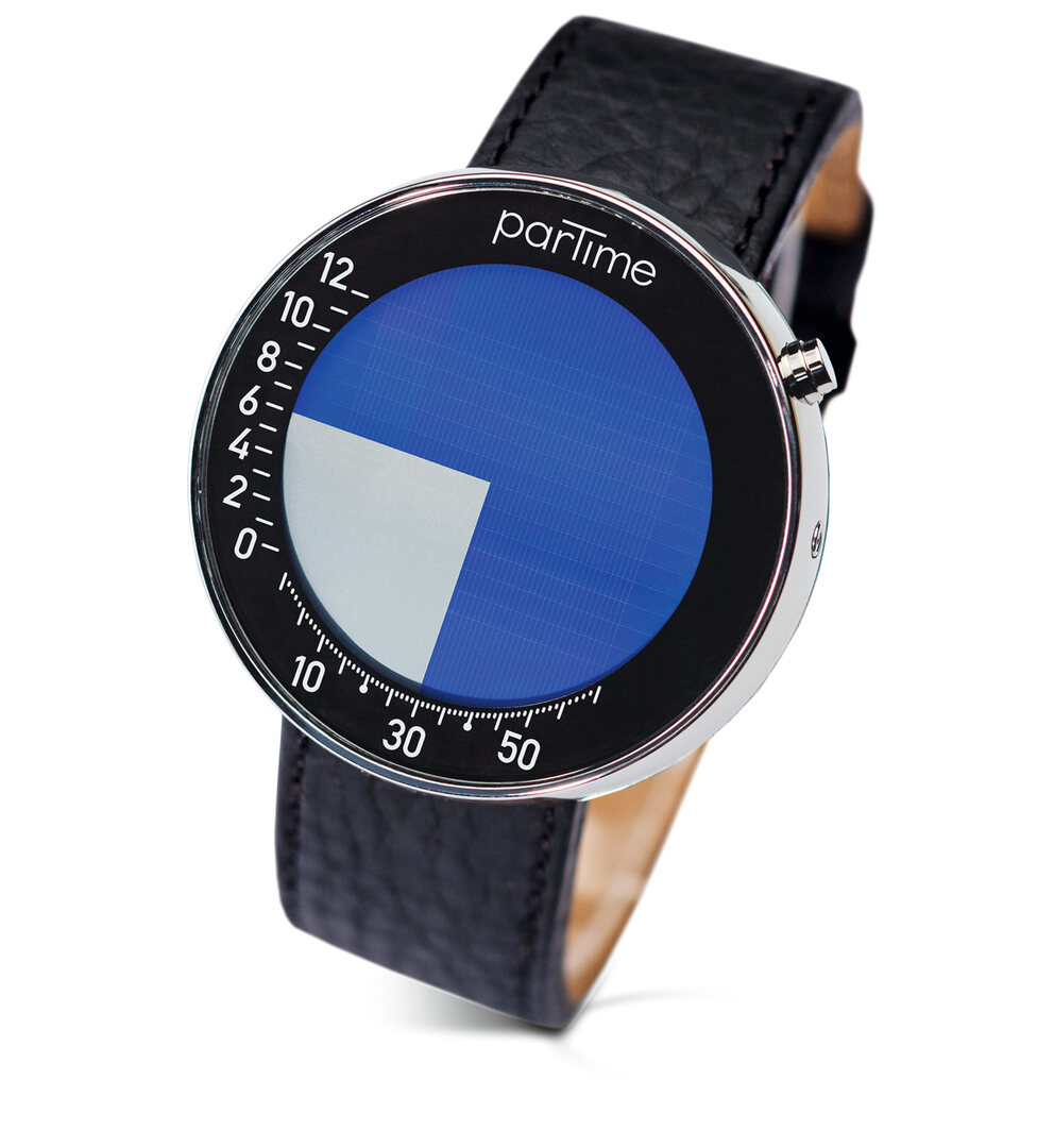 The Partime wristwatch has an unusual watch face: the right angle in the blue circle on the watch face horizontally tells the hours and vertically indicates the minutes. At noon and midnight, the blue totally disappears and then, just like an hour glass, the cycle restarts with a complete blue circle. Aside from the graphic display, Partime also offers a digital time and date display at the push of a button. The wristwatch is waterproof and shock resistant and its battery lasts for 20 months.