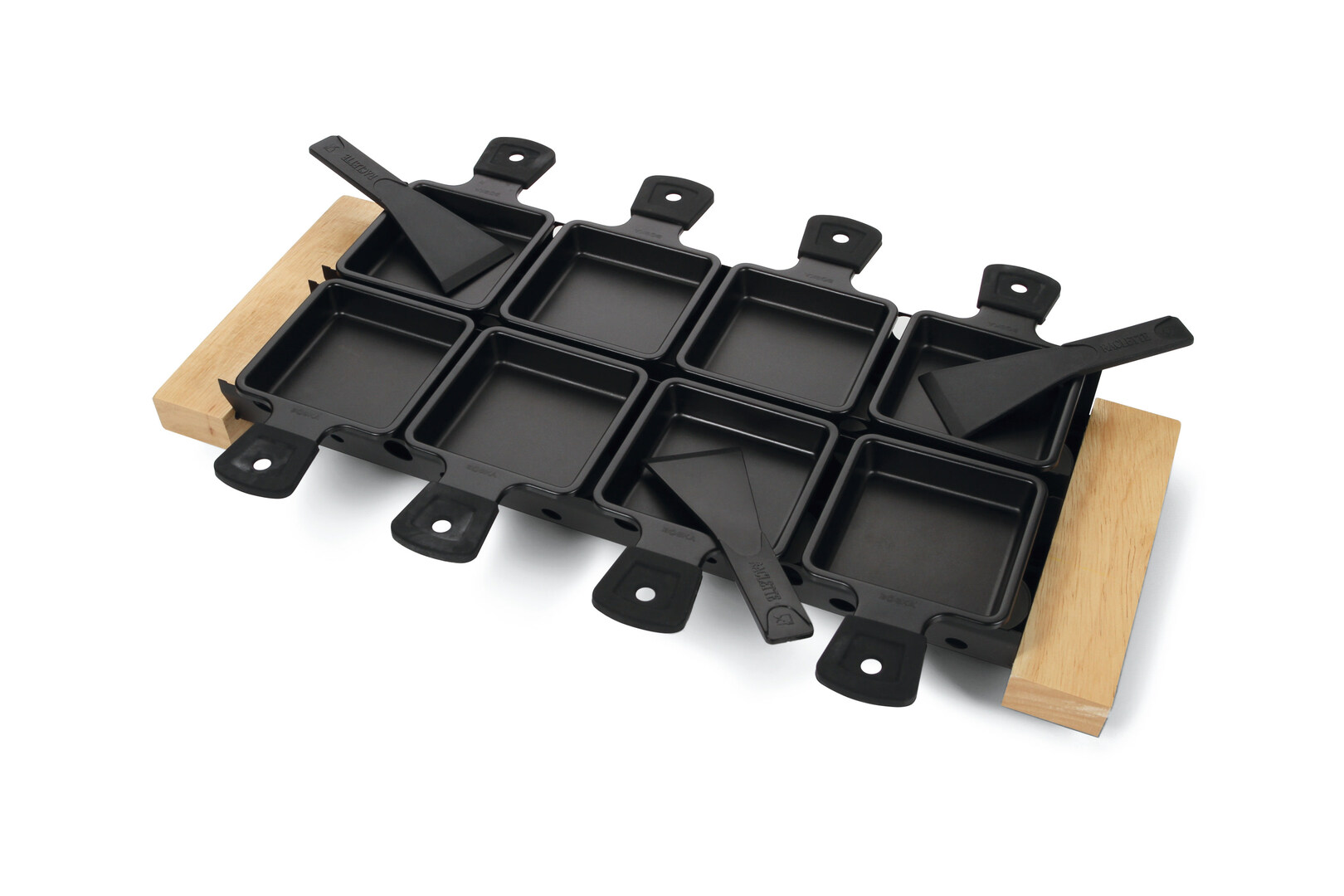 Partyclette XL is a raclette set with eight melting trays, which are heated by 16 tea light candles in a convertible rechaud. Wooden bars on both sides serve as handles and provide a warm, homely ambience. The matt black coated rechaud contrasts beautifully with the natural wood surface. The non-stick raclette trays can be used for a wide variety of heatable foodstuffs. Each tray comes with a spatula to turn and scoop out the food.