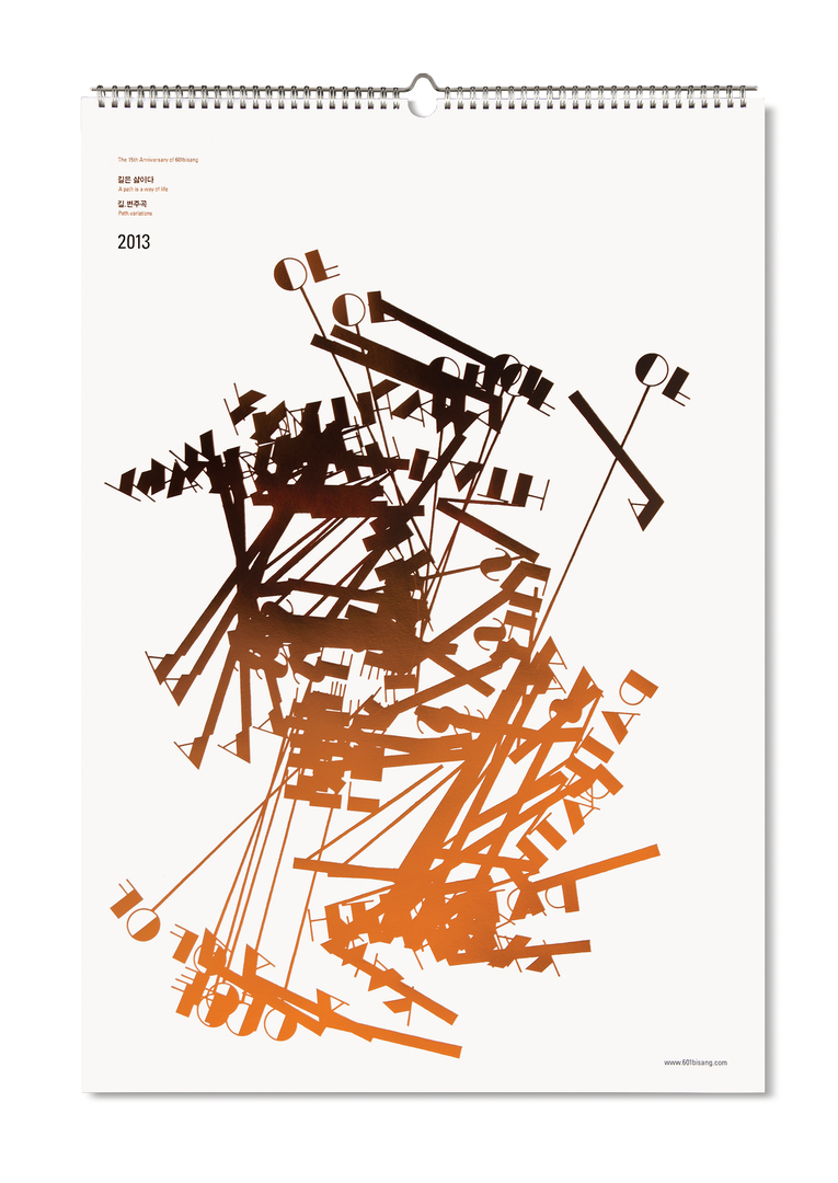 Celebrating its 15th anniversary, the agency 601bisang looked back in time to trace its development and chose the image of the “path” to convey this in calendar form. The meaning of the metaphor was expressed visually through corresponding letters from the Korean Hangeul alphabet. Two sheets of film were superimposed to illustrate variations of the image. With the statement “every path resembles the shape of our lives”, this calendar captures the creative spirit of the agency.