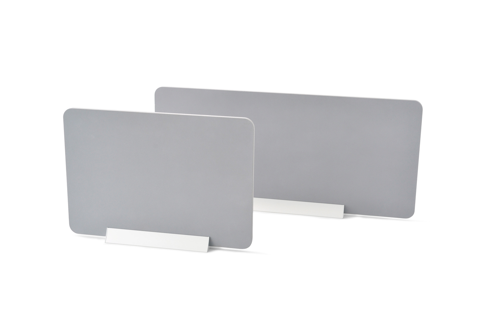 The Patis desktop partition was designed in response to the need to find a balance between personal productivity and group communication in large office spaces. It is easy to install on flat worktop surfaces and is stabilised by an elegant aluminium base. Reusable adhesive pads on the underside ensure that the partition remains upright and also allow them to be easily rearranged. The height was chosen to guarantee both work privacy and unobstructed communication with colleagues. Available in two lengths, the partition boards are horizontally slidable, allowing flexible adjustments for different room configurations.