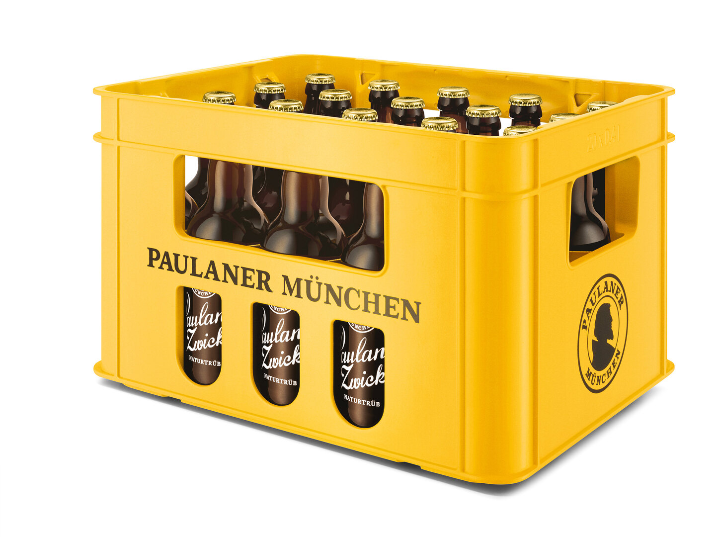 Paulaner Zwickl is the newcomer in the beer-speciality range of the traditional Munich brewery Paulaner. Its permanent bottle decoration is exceptional in the German beer market and allows for maximum differentiation from the competitors. Its specific shape and size and maximally reduced design mirrors the special product inside. The use of just one label reduces waste by two-thirds and the specific bottle size of 0.4 litres offers new consumption possibilities. Based on historic beer crates, a special crate was designed combining traditional values with modern production requirements: with its modular format, it can still be packed on standard Euro-pallets together with any other standard beer crate.