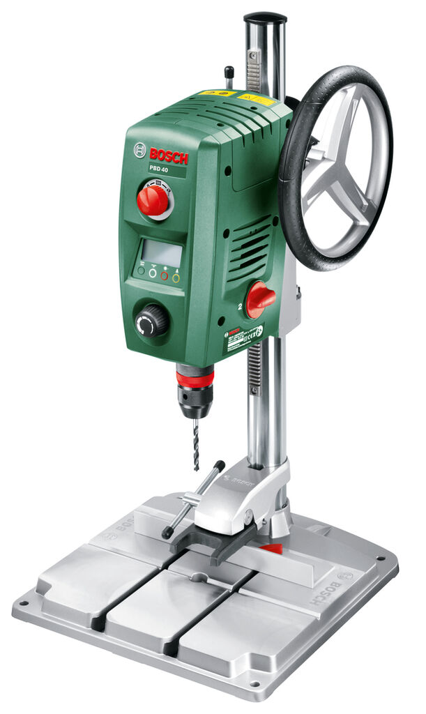 In this bench drill, a universal motor replaces traditional belt drives, allowing the continuous adjustment of speed. Users can read the selected speed and drilling depth on the digital display. The drill bit is lowered by a setting wheel, while the position of the hole is indicated by a laser crosshair. An LED light provides good illumination conditions. The V-groove in the base plate ensures a secure position, even for round work pieces like pipes, which are fixed by a quick release clamp.