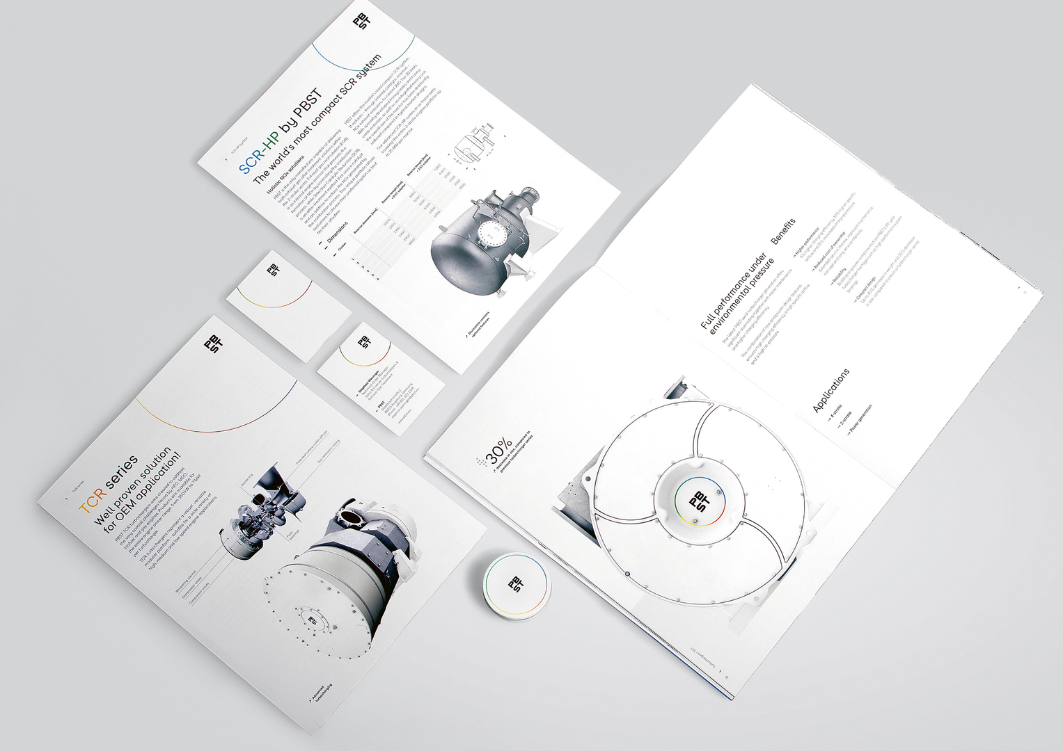 The new corporate design of PBST, a manufacturer of turbochargers, is based on the features of the company’s core products and services. Thus, as an inherent characteristic, the company logo features a rotating movement around a centre: the distinctive word mark in the centre forms a solid constant, while the circle enclosing it is applied in different radii. Another striking element is the use of a wide colour spectrum to illustrate the diversity in products and services. The geometric formal language exudes a homogenous appeal with texts, product images and colour accents standing out distinctively against the generous white spaces.
