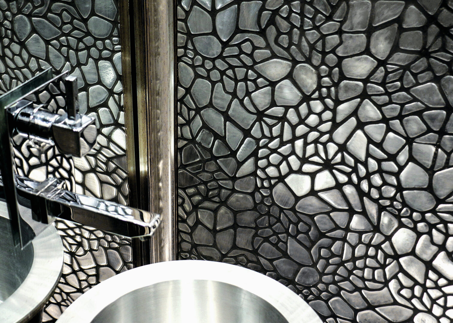 Wall tiles from the Pebble collection are reminiscent of mosaics. Tiny, individual forms of resin that look like pebbles are used to compose the shape of a star. Thanks to their carefully considered geometry, they can be assembled in any pattern desired to create large-surface wall coverings. The resin tiles are light-weight, durable, eco-friendly, waterproof and available in a number of different colours, if requested, also in a mirrored finish. In addition, the tiles can be customised with photos or graphic designs.