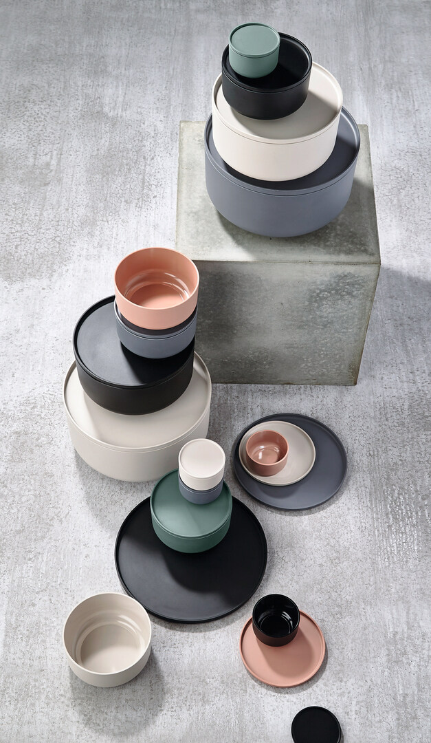 This reinterpretation of a bowl and dish emerged through inspiration from Danish design tradition. The lid sits flush on top of the bowl and thus makes this dish suitable for preparing, serving and storing food. This flat lid can also function as an elegant dish or tray for serving tapas or snacks. The matte exterior surface forms an appealing contrast to the shiny surfaces on the inside. The bowl is available in different sizes and colours.