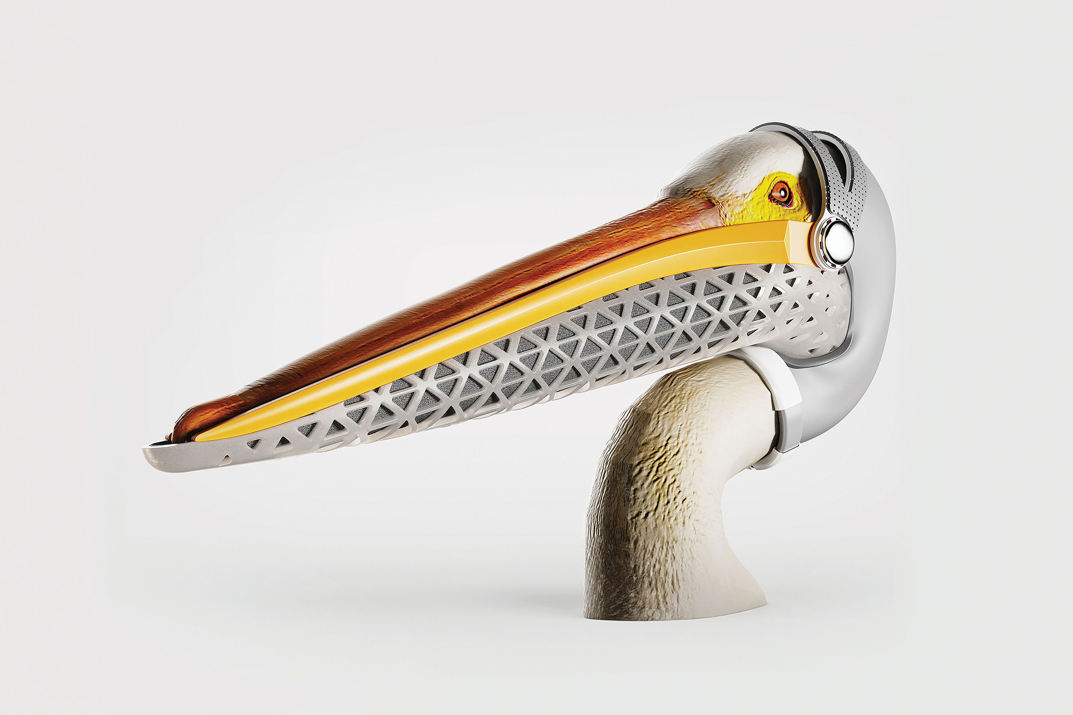 A pelican's gular pouch is prone to lateral tearing and extensive damage, often preventing the bird from hunting. Pelican Patch is designed to help repair damaged gular pouches by combining a high-elasticity mesh structure that provides stability with a small fixing head-mounted piece. To repair a gular pouch, release the fixing collar of the Pelican Patch and secure the mesh structure onto the pelican's beak. Next, lock the fixing collar in place at an optimal position around the beak. Finally, insert the magnetic closure into the connection between the artificial gular pouch and the attached fixing headpiece to complete the product installation. The injured pelican can now hunt and drink water. With Pelican Patch fitted, a pelican can move freely as they dive, hunt, and feed efficiently in the water without hindrance, since the product's design fully takes into account the natural body movements of pelicans. The highly elastic TPE plastic material is flexible enough to remain firmly attached while enabling normal swallowing and producing no discomfort during hunting. Whether feather grooming, flying, hunting, or drinking water, Pelican Patch adapts flexibly. Red Dot Award: Design Concept | Red Dot: Next Gen Award | Concept | Pet Care, Furniture and Accessories