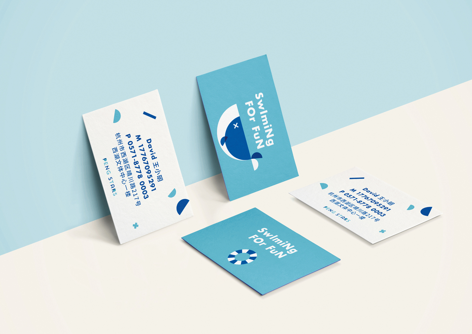 The Peng Stars swimming school was founded by former world champion swimmer Wu Peng. His educational concept involves getting parents to accompany their small children during swimming lessons. Thus, the playful brand design is inspired by the close bond between parents and children. The logo shows two overlapping whales that emphasise the close parent-child relationship. The dark blue represents professionalism, while the light blue stands for water and freedom. The combination of the two brand colours signifies the harmonious co-existence of these two aspects. Additional design elements further underline the child-friendly brand image.