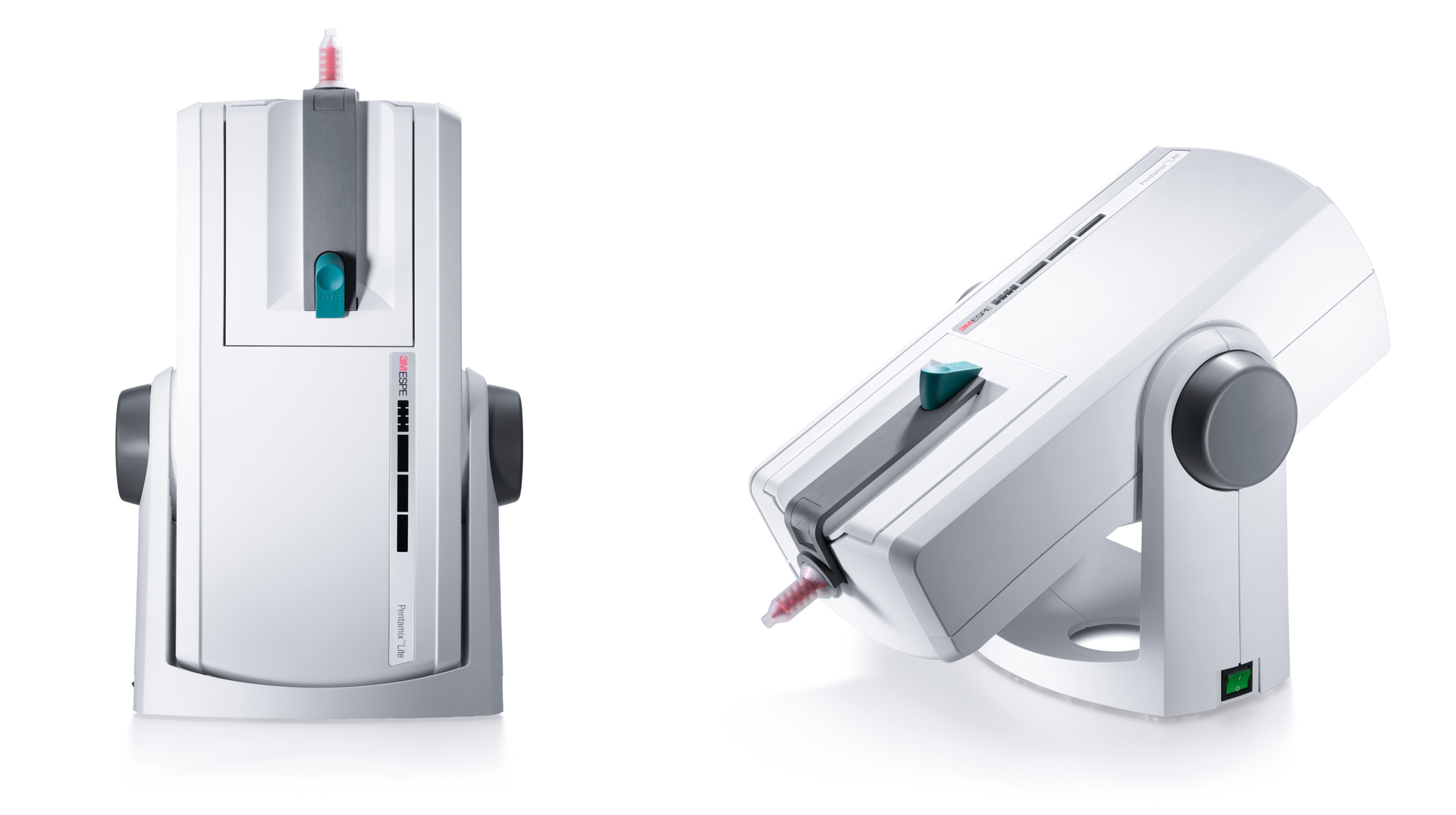 The Pentamix Lite automatically mixes putty materials for dentistry. Pressing the start button activates the mixing and dispensing of the material until the exact amount is reached in the impression tray. The swiveling mixing unit together with the base form an artistic whole – in the standby position as well as in the working position. The handwheels clearly show the center of rotation. The mixing unit is lightweight and has a very small footprint. Also, thanks to its integrated handle, the device can be easily transported.