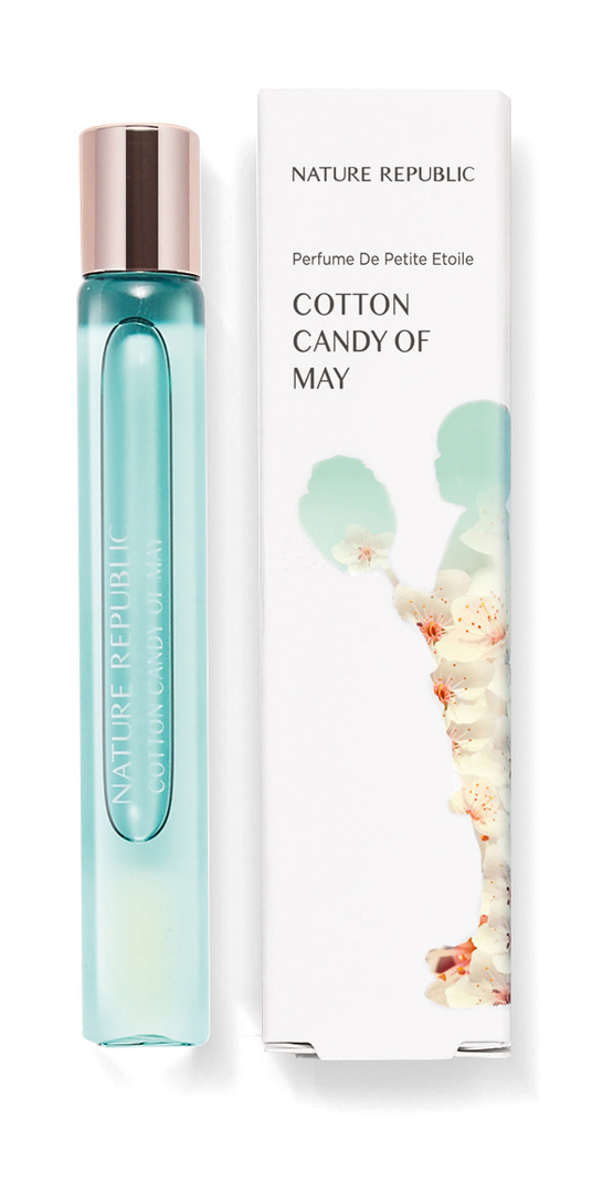 Perfume De Petite Etoile is a range of six roll-on perfumes expressing the natural beauty of children. Six different motifs help distinguish the products, for instance a spirited young girl leaving traces of a vibrant fragrance while skipping and a girl spontaneously blowing on sweet, cloud-shaped cotton candy. Within the contours of each motif, there is a photo of the perfume’s key ingredient. The bottle colour has also been selected to match this key ingredient. All six perfumes have identical rose-gold-coloured caps, which represent a natural feminine character.