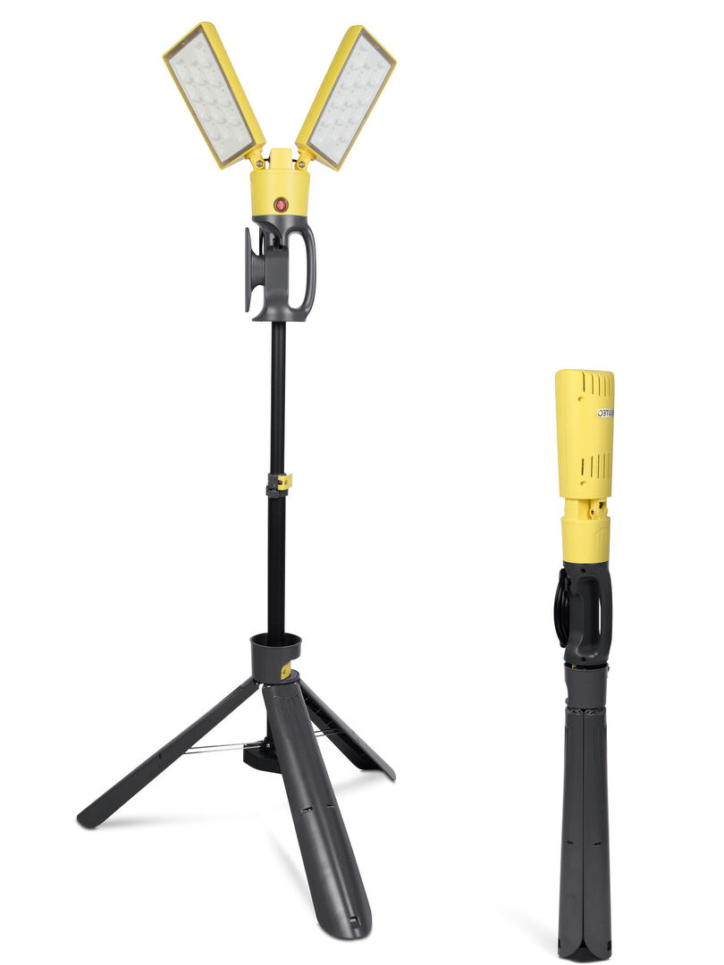 The Peri LED work light can easily be assembled and turned into a sturdy tripod floodlight. The two double heads, fitted with LEDs providing bright illumination for work areas, can be rotated vertically through 90 degrees and horizontally through 280 degrees. After use, the light can be disassembled, and transported and stored in a spacesaving manner in a few easy steps. The 2.5-metre long power cable can simply be wound up below the light heads.