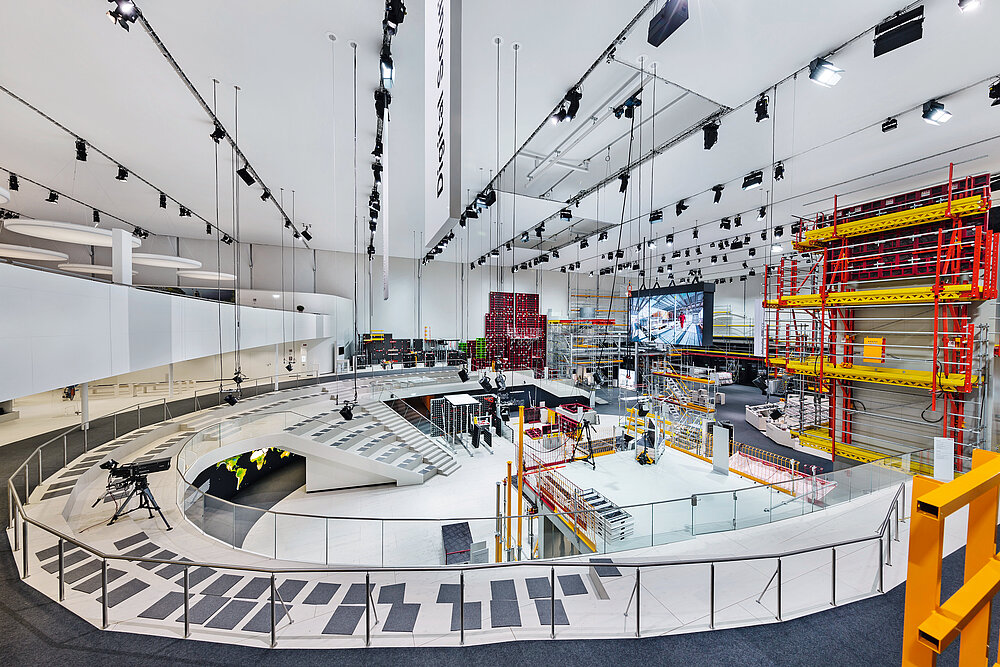 PERI is a manufacturer of formwork and scaffolding systems. A flexible and reusable trade-fair stand was developed which was initially used at the bauma 2019 in Munich on a 4,000 sqm open-air plot. A lightweight hall with printed membrane cushions was chosen to ensure fast assembly and high translucency. Inside, the cushions provided a uniform background for the different exhibits. The area of the booth was oval in shape and framed by a ramp, a balcony and an open flight of steps. A central “marketplace” was designed as a show area that visitors could follow from seats of the grandstand.
