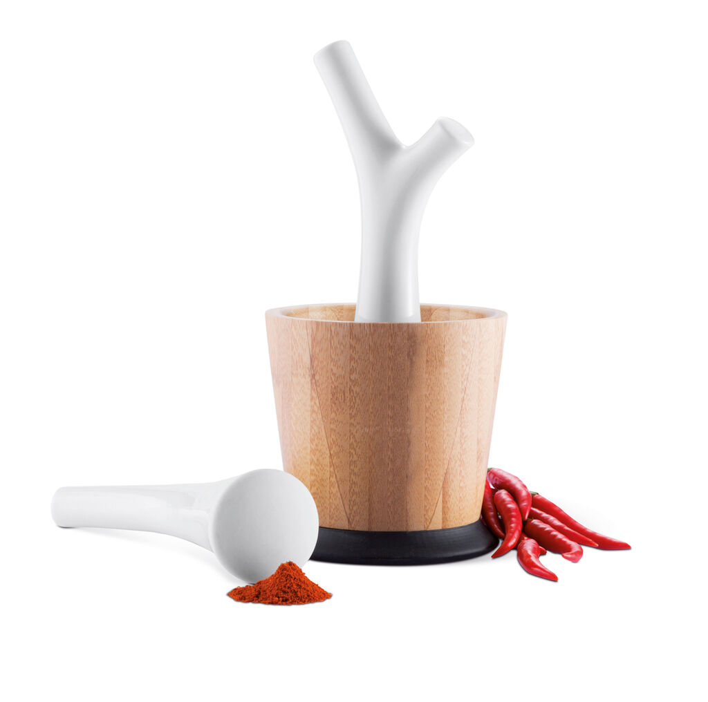 In this decorative mortar and pestle, the design concept follows the aim of facilitating the preparation of fresh dishes. Accordingly, it is possible, among other things, to mix pesto, crush garlic or pestle herbs. The registered design creates a nature-inspired aesthetics: the pestle is shaped like a branch, while the mortar together with the silicone ring resembles a wooden trough.