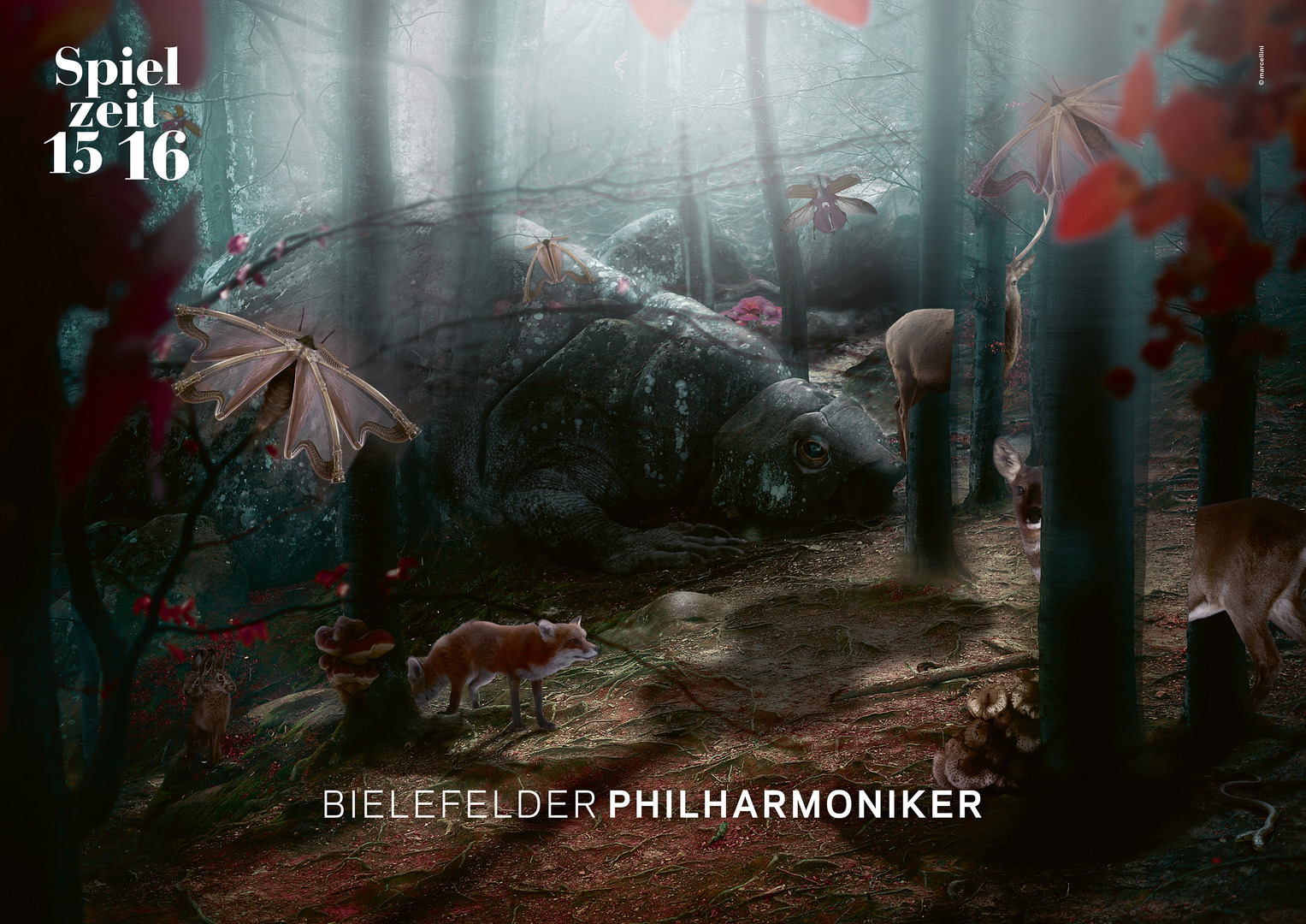 The poster series announces the 2015/2016 season of the Philharmonic Orchestra Bielefeld. The large-format motifs visualise the symphony concerts in a surrealistic manner. Inspired by the message and the instrumentation of the pieces, fantasy worlds were created which, for instance, depict harps as moths or flutes as dragonflies and complement the auditory experience with an artistic and visual element. The posters were deliberately designed without any explanatory information. The motifs speak for themselves. A City Light Poster campaign, which ran parallel, provided information about the events.