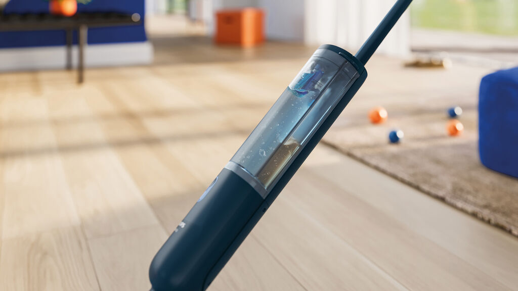 The Philips OneUp XV3101/01 and XV3101/11 cordless electric mops make floor cleaning easier with well-thought-out features. Thanks to a flat, 360-degree rotating nozzle, the appliances are easy to manoeuvre and can reach even the most difficult-to-access places. Different zones of the machine-washable cleaning cloths dispense clean water and absorb dirty water at the same time. Tactile surface textures subtly indicate interaction points and, in combination with a familiar design, facilitate intuitive operation.