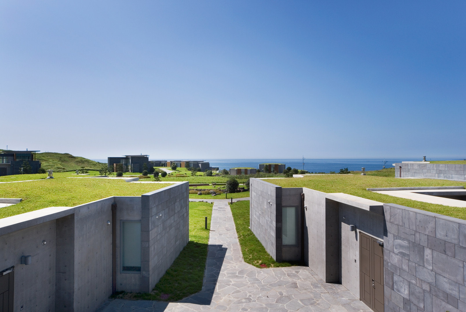The Phoenix Island Villa Condo is on the Korean island Jeju, a location famous for its natural beauty. To preserve this natural environment, the villas are laid out in terraces, so that they merge with the topography of the site. As each villa has its own individual ground level, they all have splendid, unobstructed views of the surrounding area and the ocean.
