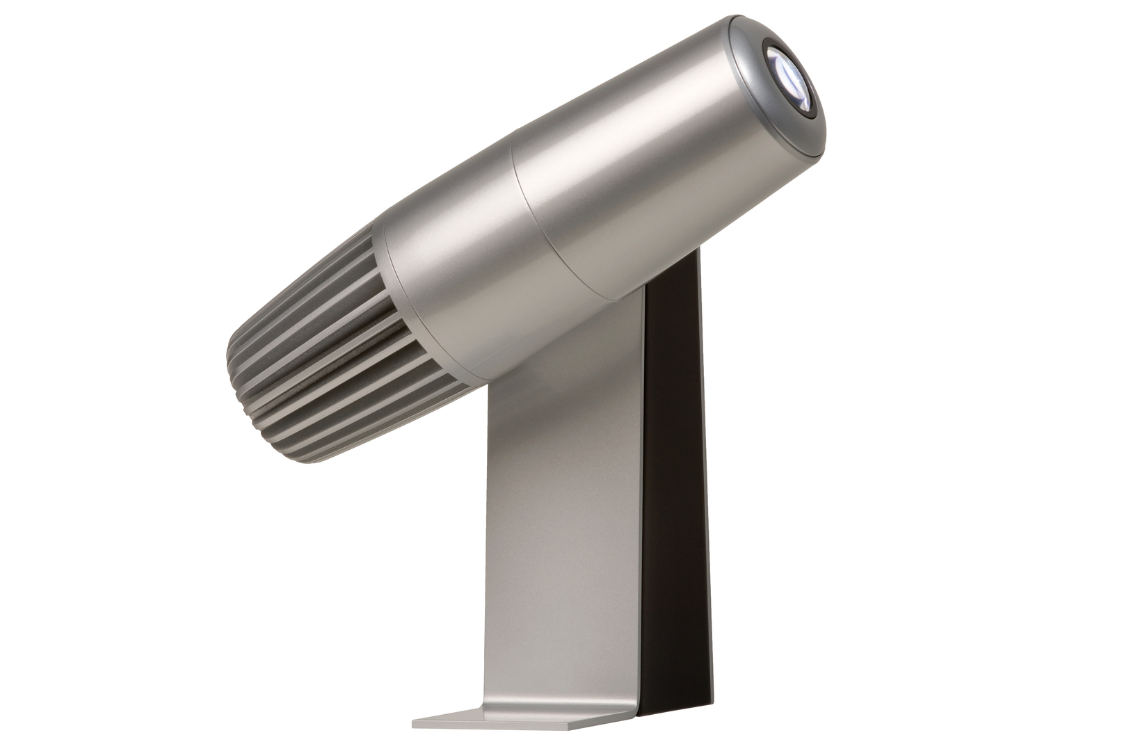 The LED projector PHOS combines a clear, elegant form with efficient light technology. The basic principle of the design is the separation of electronic components, found in the instrument’s stand, and the projection optics. The cylindrical body containing the optics is connected to the stand by a rotatable axle, which in turn is supported by a vertical base which gives the projector an air of lightness and elegance. The use of an LED light source makes a compact construction possible free of any vents. PHOS is waterproof and can be expected to last for 30,000 operating hours with an extremely high light yield.