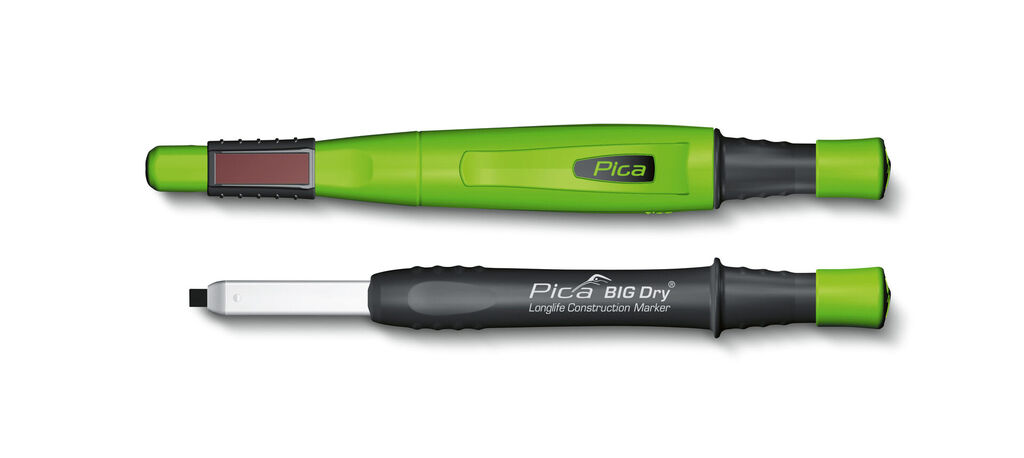 pica big dry is a pencil for carpenters which is characterised by the high-tech mechanism for its push button lead advance. This makes it easy to use, even on rough surfaces such as wood, stone or masonry. The robust rectangular-shaped leads, which are 2 × 5 mm thick and 150 mm long, allow for precise edge guide when marking out objects and enable long markings in one go. The leads are easy to replace and optimally protected against dust and moisture in the practical quiver box with a special clip cap.