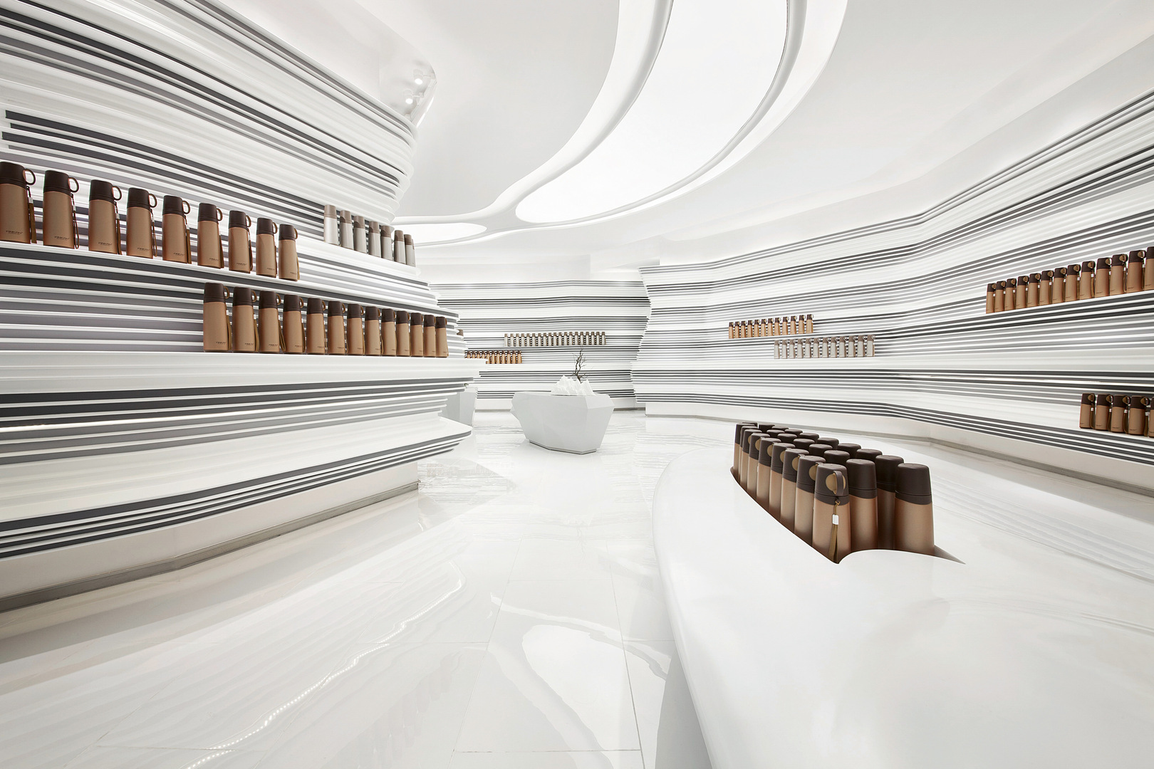 The inspiration for the design of this showroom is the appreciation of life in nature. The concave and convex surface structure of the wall recalls the weathering effects of rocks and conveys a sense of the present and the future. Curves and streamlines organically combine showcases with the space, creating a smooth, agile, but at the same time tense atmosphere. The lighting and the white and grey colour concept produce an environment in which the exhibits take the leading role.