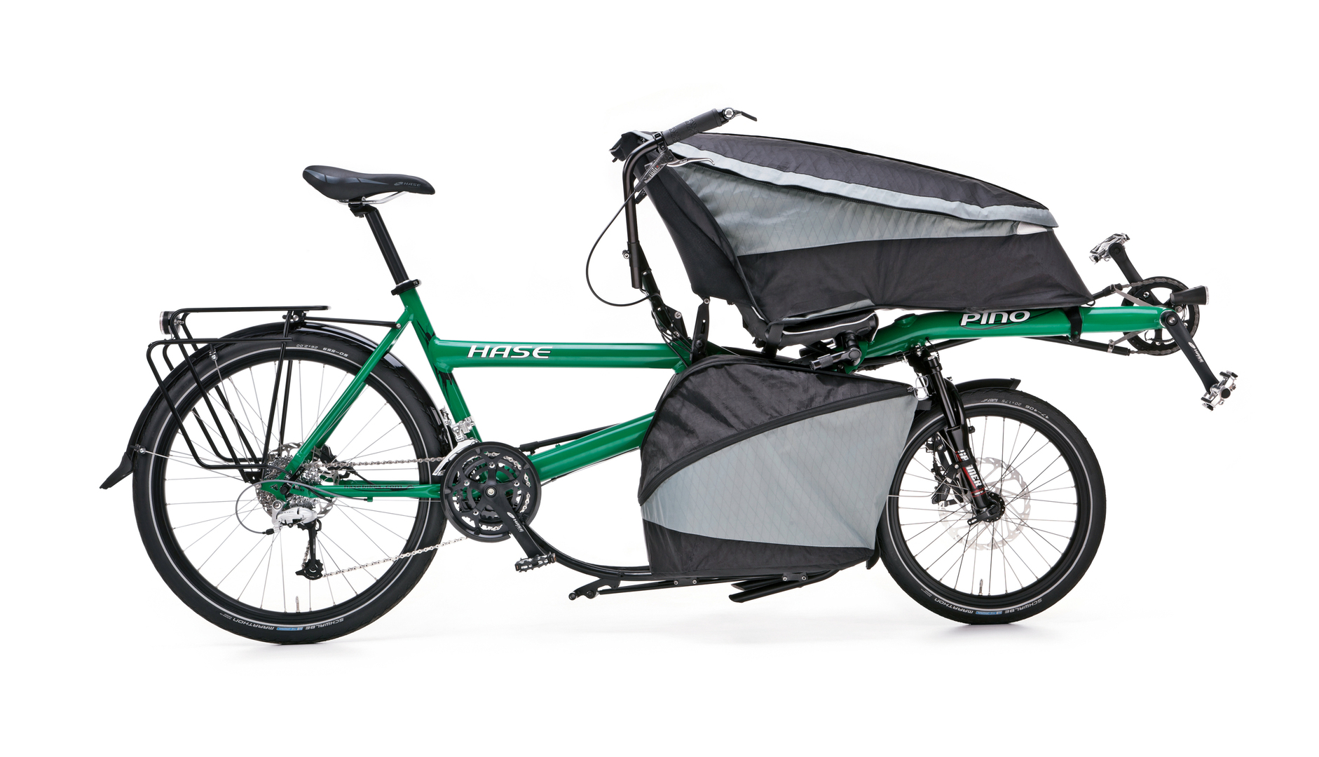 The Pino Porter, a consistent further development of a combi tandem, is transformed into a cargo bike in a few easy steps. The big Porter Bag can be mounted on the front seat in seconds and has a load capacity of 80 litres or up to 40 kg. More cargo capacity is offered by the fold-up Porter Rack, which is mounted below the front seat as a luggage carrier. It transports loads of up to 40 kg, with enough space for two beverage crates. When used in combination, the bike offers plenty of space and a total cargo capacity of 80 kg.