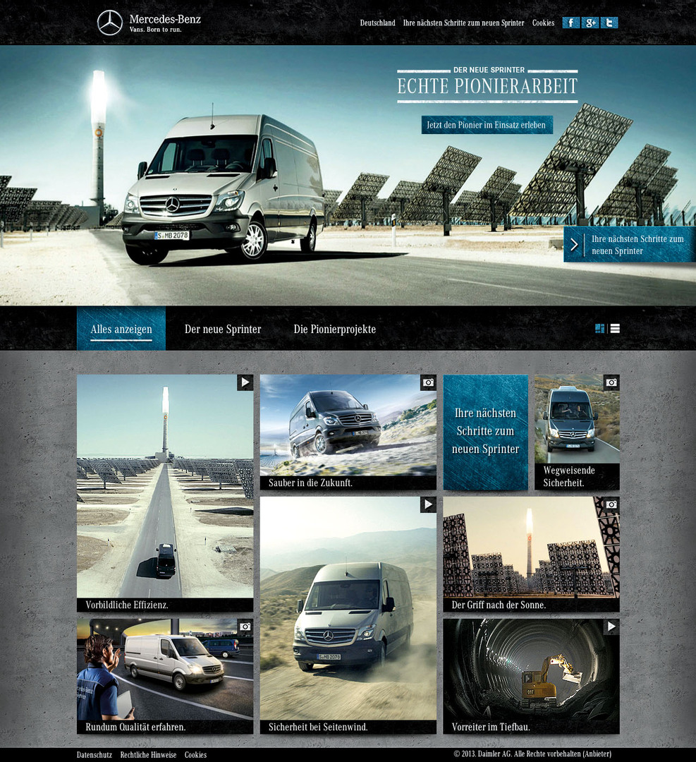 “Pioneer at Work” is a microsite that presents the new Sprinter model as the best in its class and aims to further expand its market leadership. For this purpose, the vehicle is presented as a pioneer in stories based on real, innovative projects, cutting-edge construction sites and marvels of engineering. An interactive film invites users to “drive” the Sprinter themselves while further film clips, animations and graphics provide a wealth of additional information. A news stream provides quick and easy access to further content via images.