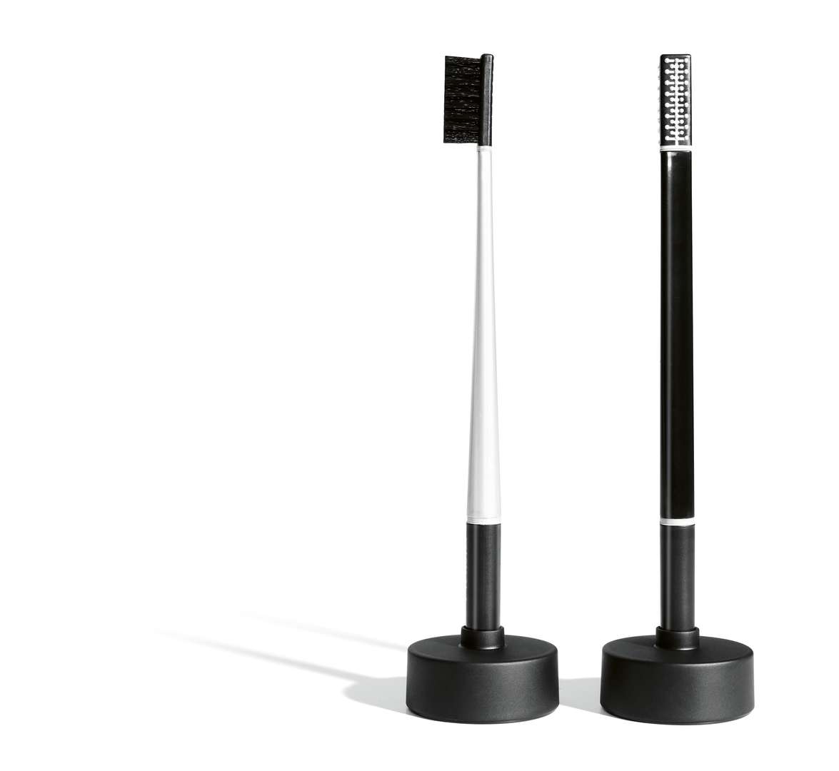 The design of the Piuma toothbrush focuses on straight lines and contrasting colours. Particularly lightweight materials originating from the medical industry give the brush high flexibility and stability at the same time. The handle is ergonomically well-conceived, and its surface finish ensures symptom-free hand movement during dental care. Discreet nubs for care of the tongue create an additional optical effect. A patented system inside the matted base, made of innovative material specifically designed for this application such as Gravi-Tech, indicates the age of the toothbrush.