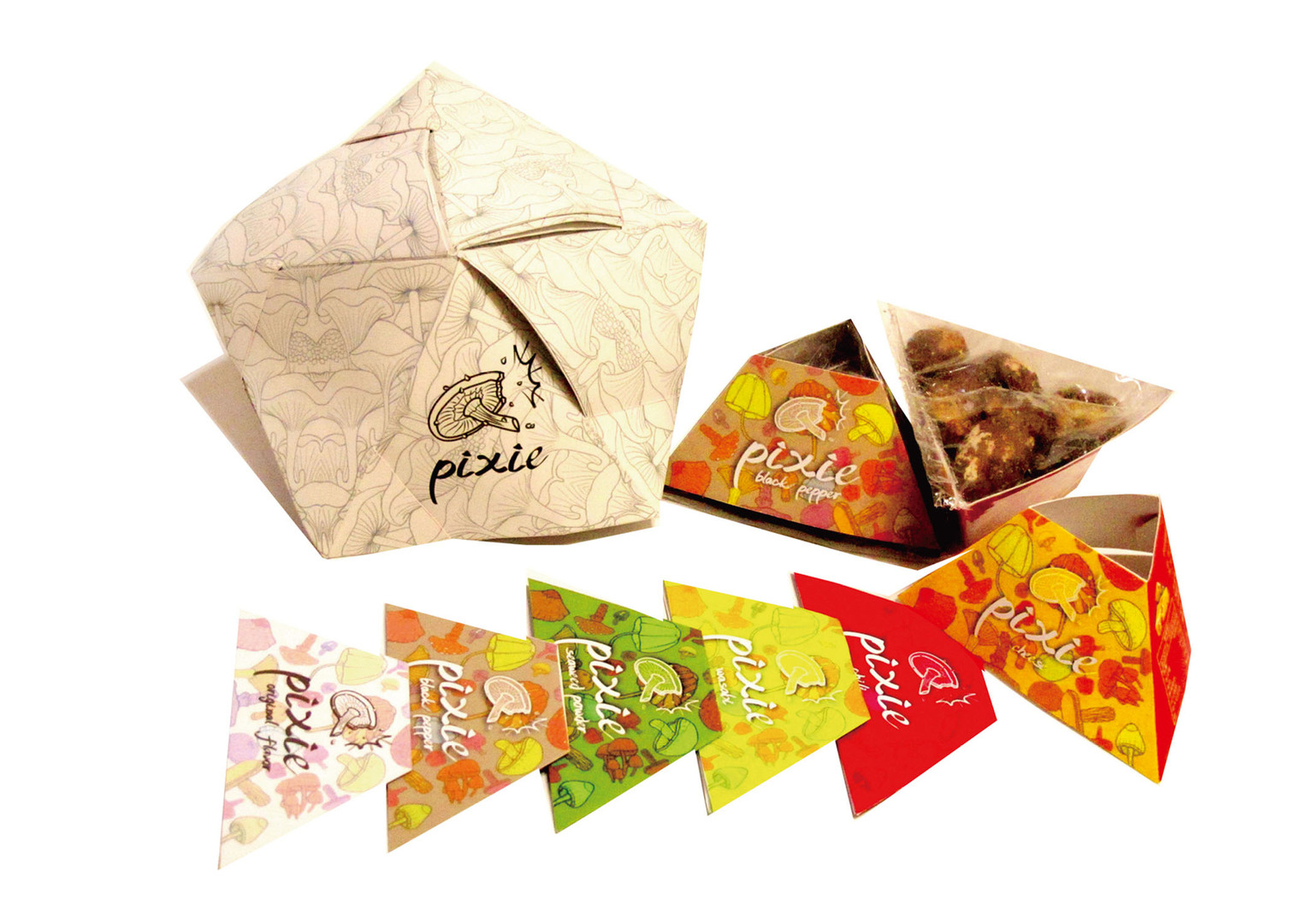 The pixie – a small, mischievous, forest-dwelling supernatural being – was chosen to portray this mushroom snack. The goal behind the packaging design was to promote a wholesome snack that helps build interpersonal relationships in everyday life when shared with friends. The visual design focuses on a fresh and original flavour, with a variety of illustrations of mushrooms. Made from environmentally friendly paper, the packaging looks inexpensive. The seamless packets are visually appealing and suitable for an assortment of foods in limited amounts and other small everyday objects and accessories.