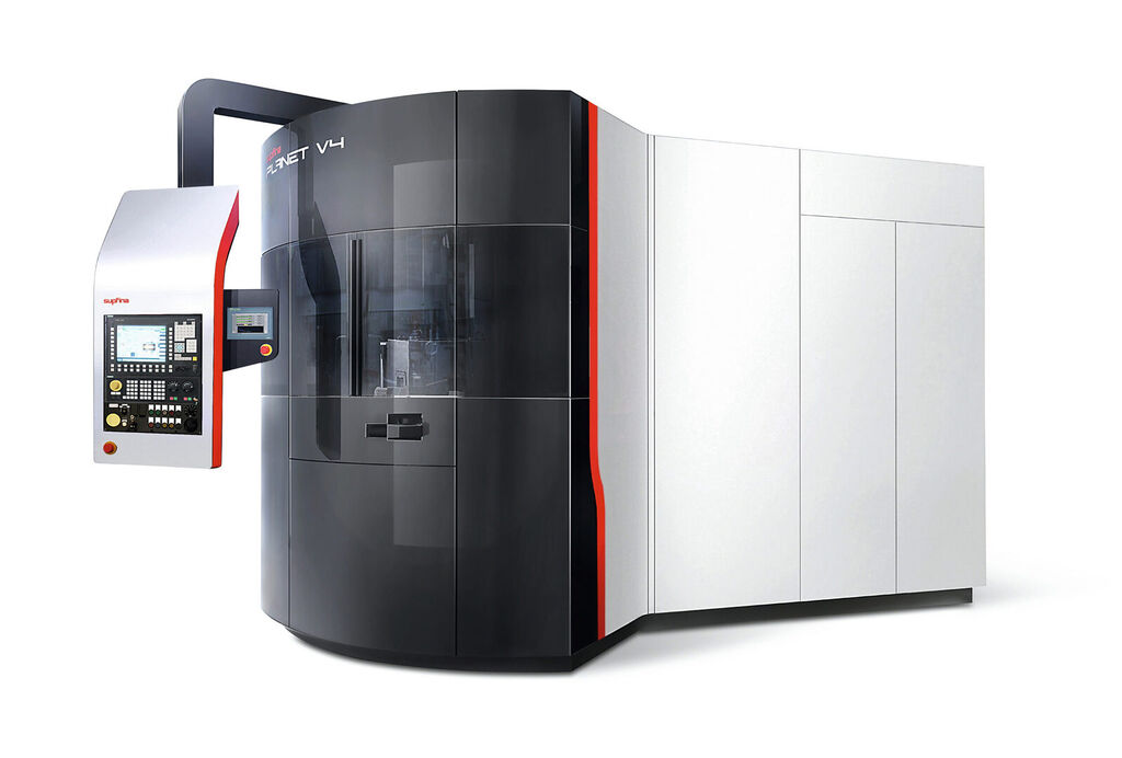 Due to its compact size, the Planet V4 double disc grinding machine requires only a small base area. The operating panel can be moved along the entire front of the machine. The dark, curved front with its large viewing area visually puts the machining space into the foreground. A vertical red line marks the boundary between the machine’s front and rear. The light-coloured metal panels at the rear enable direct access to all the machine parts that require maintenance.
