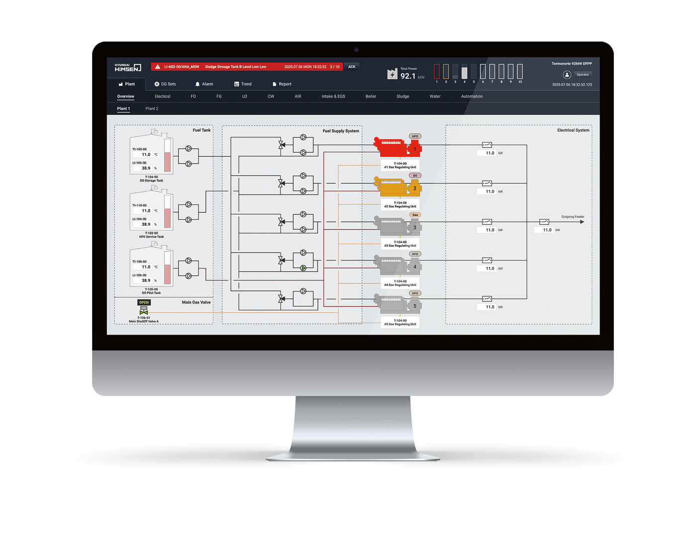 The Plant Control and Monitoring System is an industrial control interface that presents relationships and the status of plants with reduced flowcharts and standardised icons, allowing users to focus on the essential information and intuitively grasp the plant’s operational situation. Consistent colour schemes are used for the background, while eye-catching colours highlight fault conditions, so that emergencies are quickly recognised. The menu buttons are structured to allow users to easily access all screens to ensure seamless operation.