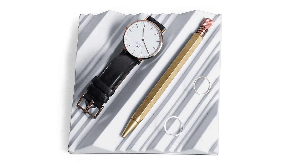 This plate set comprises an ensemble of grey and white plates, in a round as well as an oval shape. The larger, oval plates serve as a base for placing a smaller round plate either in the middle or toward the side. The two colours can be combined – white on grey, or grey on white – to create an appealing overall harmonious image. The base on the underside of the plate is invisible from above, creating the impression that the plates are floating.