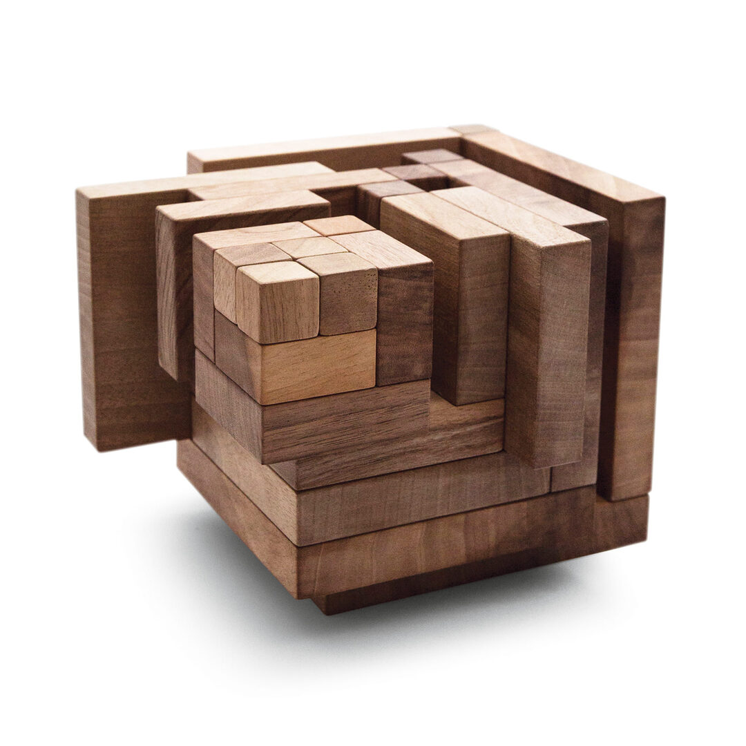 Plattenbau is a cube assembled from 25 softly polished fine wood components. It is both a learning element and a toy at the same time. Its individual components can be assembled and combined in all different ways. Due to the haptic and intelligent construction of ever new forms, not only the perception of space qualities and the orientation in space are trained, but also the skills in abstract and strategic thinking. Plattenbau sees itself as an homage to the space concept of early Bauhaus and as a learning tool which serves the comprehension of complex relativities.