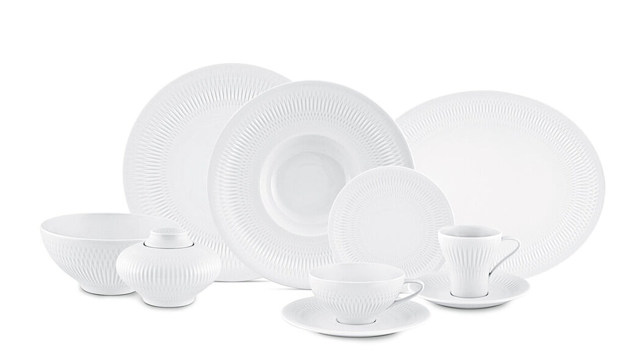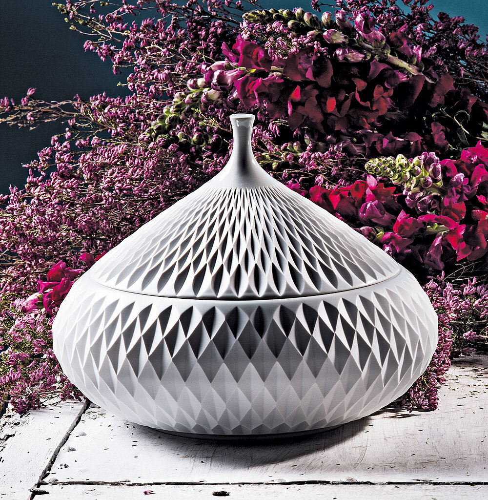 The creation of Plissé was inspired by the idea of taking familiar crystal glass engravings and translating them onto a porcelain vessel. The innovative manufacturing process was developed as part of a collaboration between two companies. Leaving the porcelain factory smooth and glazed, the pieces are then handed to highly skilled master crystal engravers who cut each groove manually. Employing grinding and cutting techniques with diamond-edged wheels, the porcelain surfaces are sculpted to obtain a texture that is highly defined and detailed.